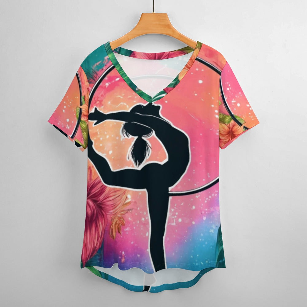 Designed with a loose fit and a flirty V-neck, this basic tee offers a flattering look for all body types. The lightweight fabric ensures breathability and ease, making it an excellent choice for both high-intensity performances and casual outings.
